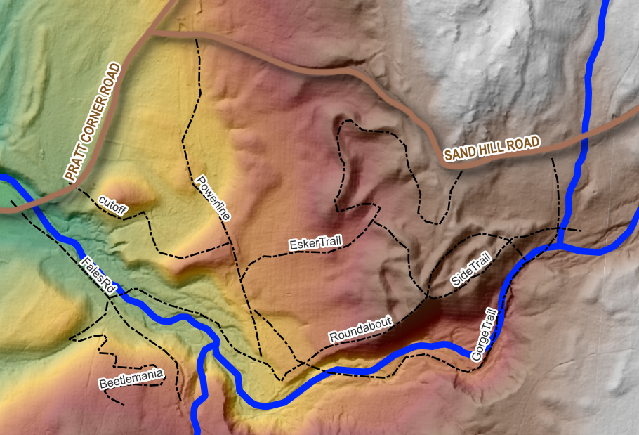 - The Route: We will begin at Atkins Reservoir along Cushman Road and walk along Dean Brook to Sand Hill Road. From there, volunteers will shuttle participants back to their cars at Cushman Road. We may also visit Amethyst Farm to observe differences in water quality across the watershed. Below is an image of the Dean Brook area we will be exploring.
